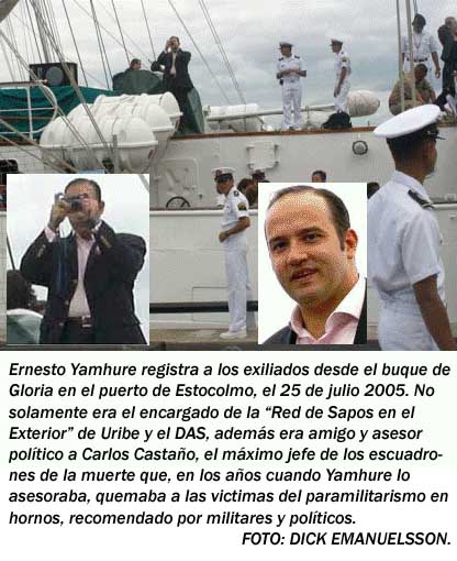 O informe do DAS-G3, ou seja, informe da Rede de Informantes em Estocolmo, certamente enviado por Yamhure a seu chefe Jorge Noguera em Bogotá, no qual se informa sobre a manifestação dos exilados em Estocolmo na chegada do navio Gloria da marinha colombiana. O comunicado é enviado em 8 de agosto de 2005 e consta na página 124 do processo de que foi vítima o jornalista e co fundador da Anncol, Dick Emanuelsson, um dos seis grandes jornalistas na Colômbia que foram vítimas do terrorismo do DAS-G3. CLIQUE PARA AMPLIAR |